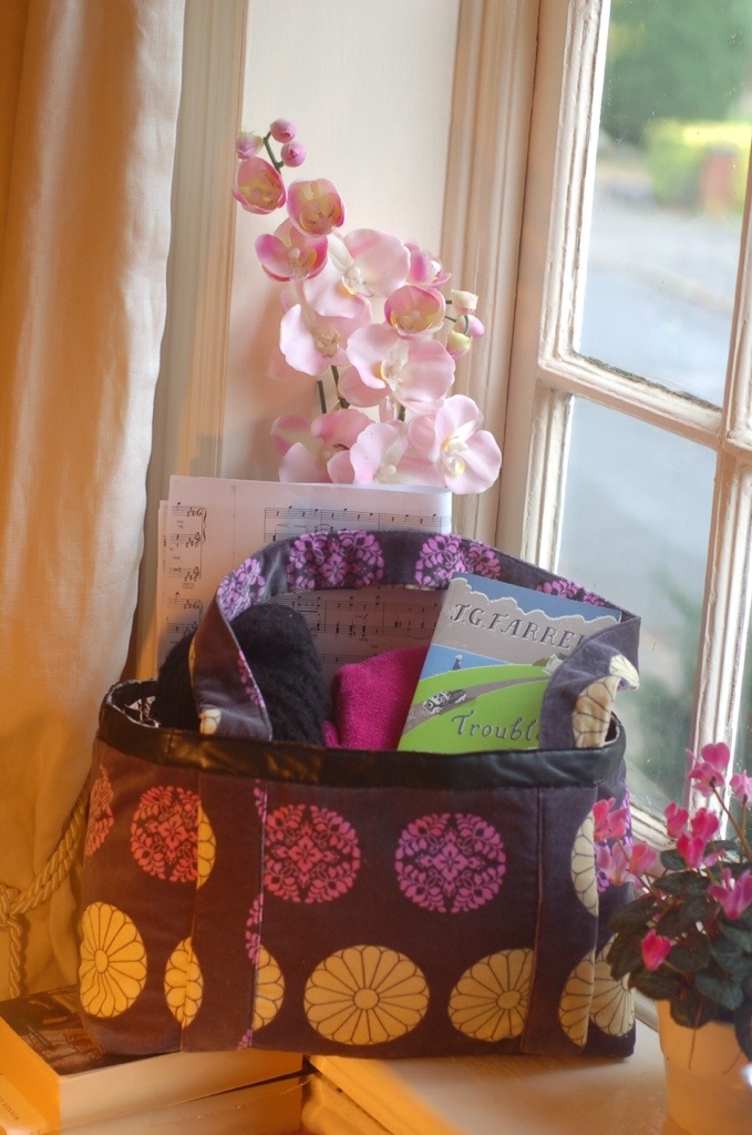 I used Amy Butler velveteen in Pressed Flowers from the Alchemy range. It’s lovely fabric although not the best choice for a novice bag maker as it frayed badly and developed 2 or 3 holes in ham-fisted making up. Next time I’ll use a less fragile cotton. I’ve scotchguarded the bag but am a bit nervous about subjecting it to the real world of rough and tumble.