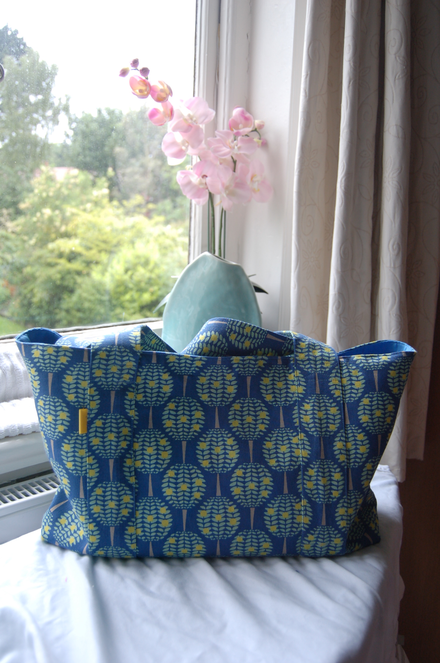 A summery version of the velveteen Amy Butler bag. It’s finished but hasn’t been outdoors yet. Still lurking in the safety of home.
